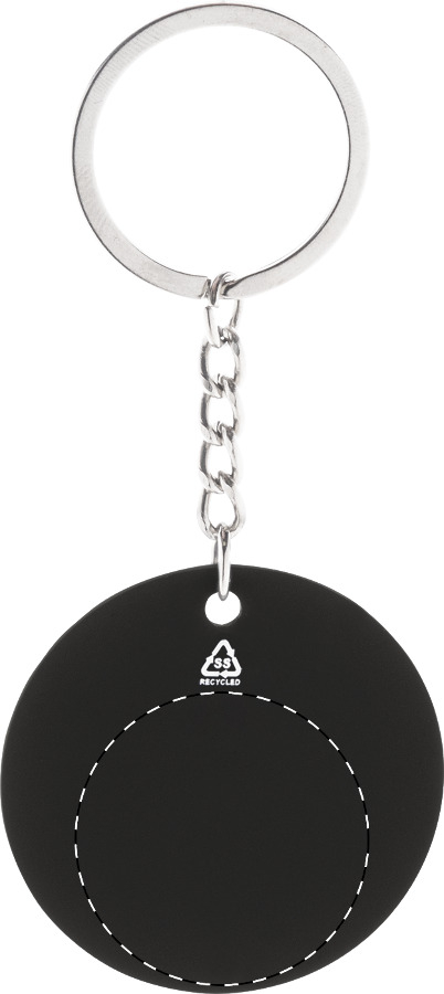 2-delige cadeauset in zwarte papieren geschenkdoos. Inclusief gerecyclede aluminium balpen met rubberen afwerking en blauwe vulling, en gerecyclede roestvrijstalen sleutelhanger met rubberen afwerking. Beide items zijn voorzien van een speciale coating voor het lasergraveren van spiegels.