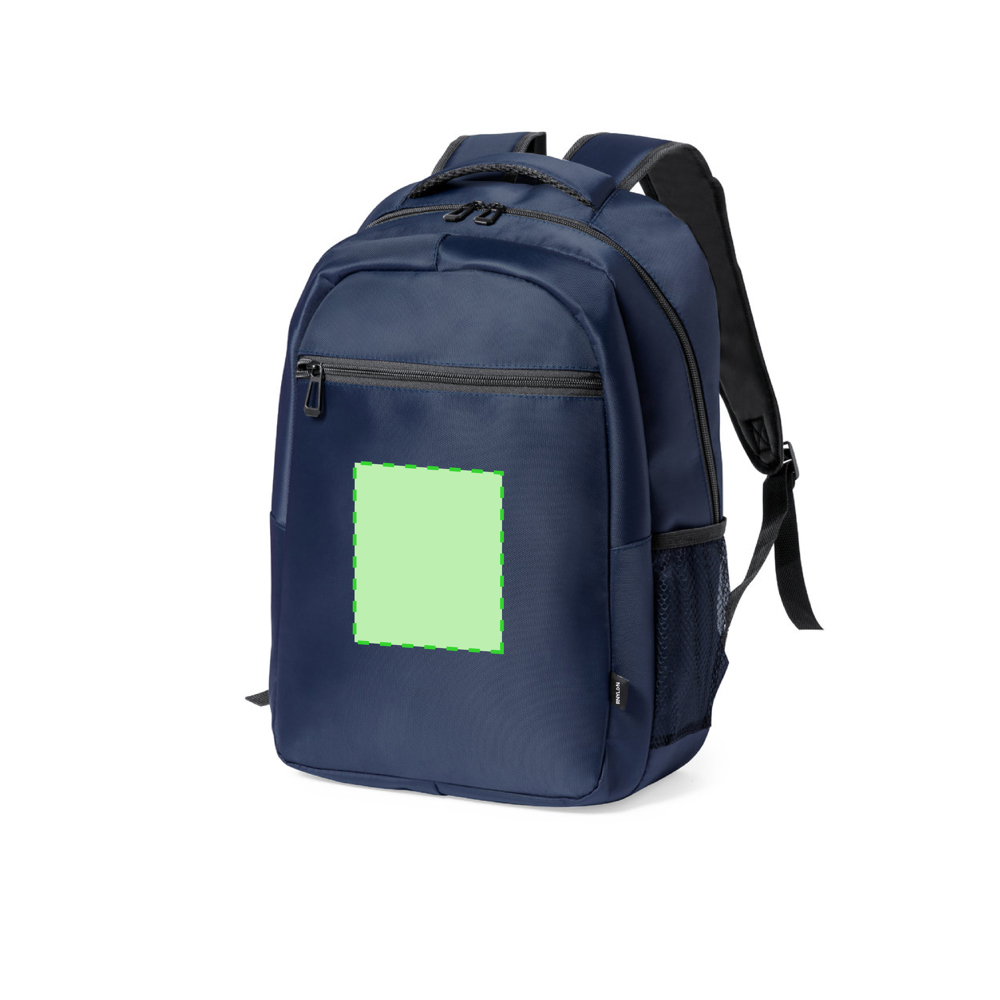 Hoogwaardige rugzak van 420D RNYLON. Hoofdvak met bijpassende ritssluiting en dubbele trekker. Inclusief buitenvak met ritssluiting en 2 zijvakken van gaas. Gevoerde handgreep, rug- en schouderbanden, deze laaysye verstelbaar. Binnenkant met gewatteerd laptopvak voor latops tot 15 inch en bevestiging aan de achterkant voor montage op een trolly. Verkrijgbaar in een breed scala aan kleuren, met het gerecycleerde kenmerk op het label aan de buitenkant. RNYLON-materiaal is gemaatk van gerecycled plastic, om het hergebruik van plastic afval te stimuleren en de duurzaamheid van de planeet te helpen.